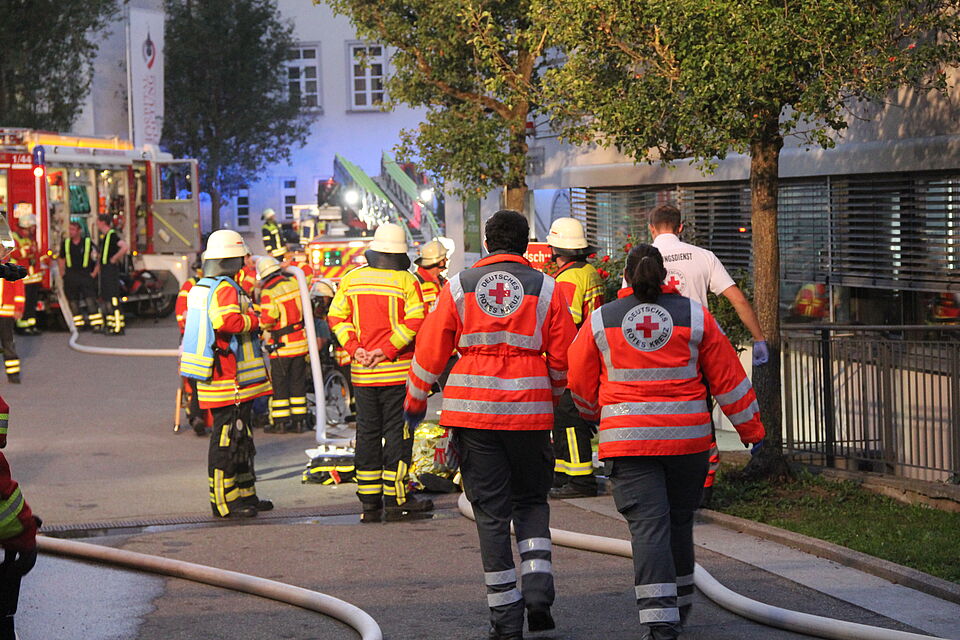 Am Freitagabend war das Szenario für die Rettungskräfte besonders herausfordernd: In einem mitten in der Rottenburger Innenstadt gelegenen Pflegeheim ist ein Brand ausgebrochen. Mehrere Seniorinnen und Senioren wurden verletzt oder waren von Flammen und Rauch im Gebäude eingeschlossen. Während die Feuerwehr die Rettungs- und Löscharbeiten aufnahm, sichtete die Besatzung unseres zuerst eingetroffenen Notarzteinsatzfahrzeugs die Verletzten. Gleichzeitig errichteten die Ehrenamtlichen der Bevölkerungsschutz-Einheit auf Anweisung ihrer Führungskräfte eine Patientenablage im Innenhof und versorgten und transportierten gemeinsam mit dem Regelrettungsdienst die ersten Schwerstverletzten. Auch das Modul Technik und Sicherheit des Katastrophenschutzzuges kam zum Einsatz: Da es inzwischen dunkel geworden war, musste der Behandlungsbereich dringend ausgeleuchtet werden. Damit auch realistisch geübt werden konnte, war unsere Gruppe Notfalldarstellung vom JRK im Einsatz und hat nicht nur realistische Verletzungen geschminkt, sondern auch auf die Sicherheit der mitspielenden Mimen geachtet.